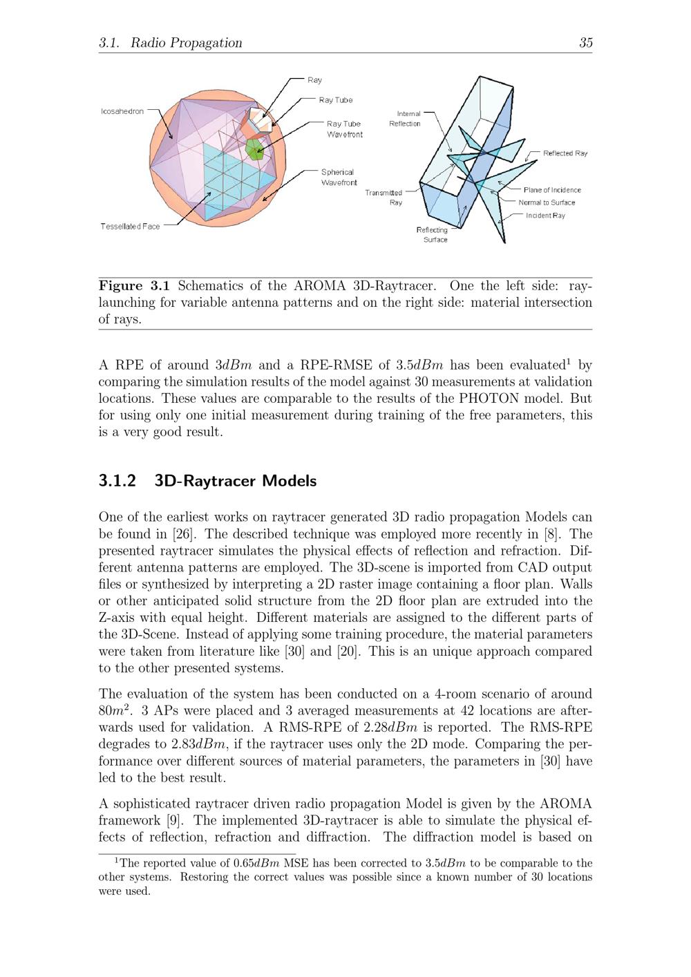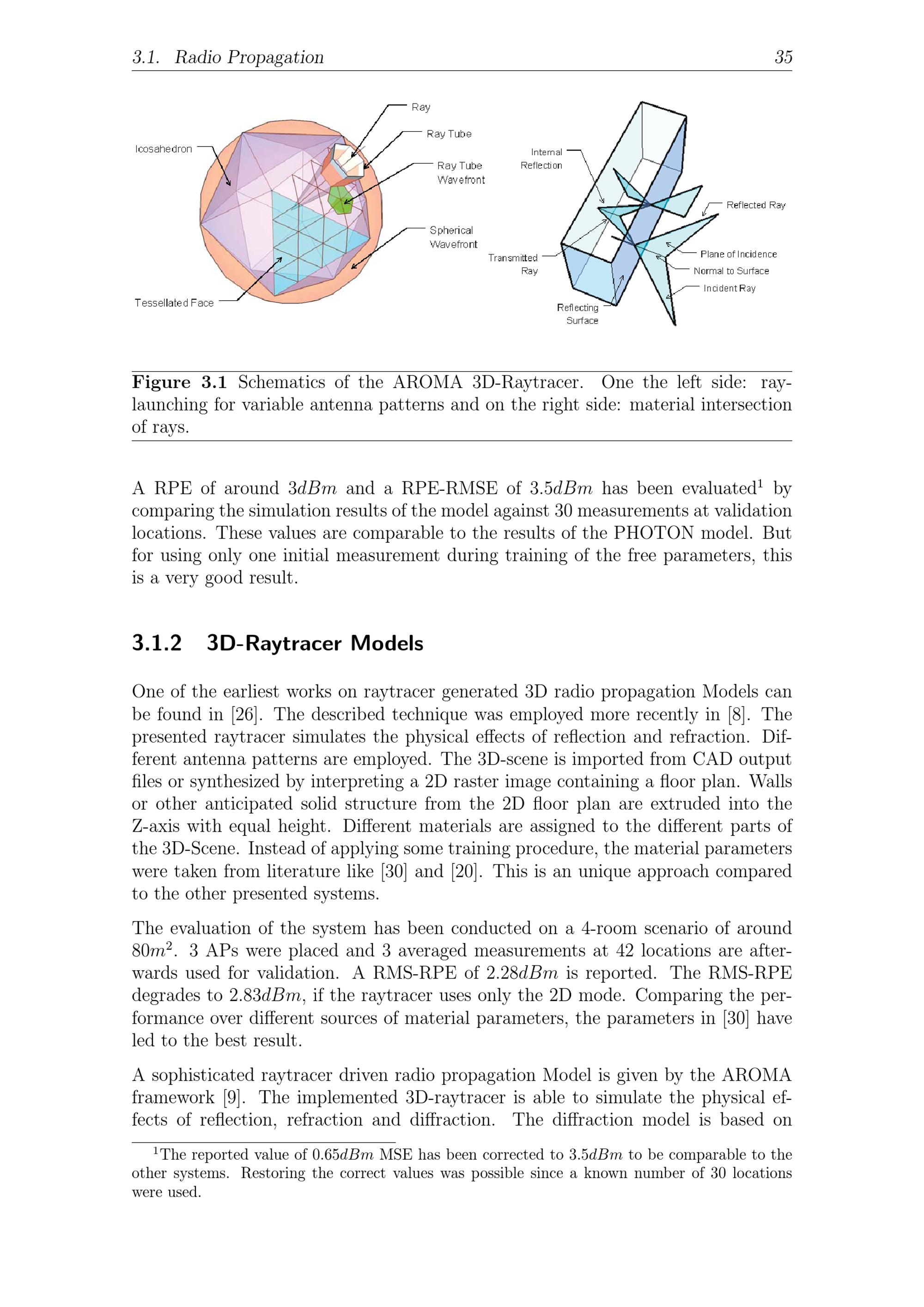 3.1. Radio Propagation 35Figure 3.1 Schematics of the AROMA 3D-Raytracer. One the left side: ray-launching for variable antenna patterns and on the right side: material intersectionof rays.A RPE of around 3 dBm and a RPE-RMSE of 3. 5 dBm has been evaluated1bycomparing the simulation results of the model against 30 measurements at validationlocations. These values are comparable to the results of the PHOTON model. Butfor using only one initial measurement during training of the free parameters, thisis a very good result.3.1.2 3D-Raytracer ModelsOne of the earliest works on raytracer generated 3D radio propagation Models canbe found in[26]. The described technique was employed more recently in[8]. Thepresented raytracer simulates the physical effects of reflection and refraction. Dif-ferent antenna patterns are employed. The 3D-scene is imported from CAD outputfiles or synthesized by interpreting a 2D raster image containing a floor plan. Wallsor other anticipated solid structure from the 2D floor plan are extruded into theZ-axis with equal height. Different materials are assigned to the different parts ofthe 3D-Scene. Instead of applying some training procedure, the material parameterswere taken from literature like[30] and[20]. This is an unique approach comparedto the other presented systems.The evaluation of the system has been conducted on a 4-room scenario of around80 m2. 3 APs were placed and 3 averaged measurements at 42 locations are after-wards used for validation. A RMS-RPE of 2. 28 dBm is reported. The RMS-RPEdegrades to 2. 83 dBm, if the raytracer uses only the 2D mode. Comparing the per-formance over different sources of material parameters, the parameters in[30] haveled to the best result.A sophisticated raytracer driven radio propagation Model is given by the AROMAframework[9]. The implemented 3D-raytracer is able to simulate the physical ef-fects of reflection, refraction and diffraction. The diffraction model is based on1The reported value of 0. 65 dBm MSE has been corrected to 3. 5 dBm to be comparable to theother systems. Restoring the correct values was possible since a known number of 30 locationswere used.