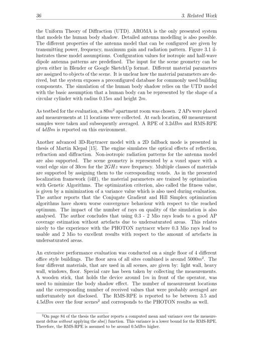 36 3. Related Workthe Uniform Theory of Diffraction(UTD). AROMA is the only presented systemthat models the human body shadow. Detailed antenna modelling is also possible.The different properties of the antenna model that can be configured are given bytransmitting power, frequency, maximum gain and radiation pattern. Figure 3.1 il-lustrates these model assumptions. Configuration values for isotropic and half-wavedipole antenna patterns are predefined. The input for the scene geometry can begiven either in Blender or Google SketchUp format. Different material parametersare assigned to objects of the scene. It is unclear how the material parameters are de-rived, but the system exposes a preconfigured database for commonly used buildingcomponents. The simulation of the human body shadow relies on the UTD modelwith the basic assumption that a human body can be represented by the shape of acircular cylinder with radius 0. 15 m and height 2 m.As testbed for the evaluation, a 80 m2apartment room was chosen. 2 APs were placedand measurements at 11 locations were collected. At each location, 60 measurementsamples were taken and subsequently averaged. A RPE of 3. 2 dBm and RMS-RPEof 4 dBm is reported on this environment.Another advanced 3D-Raytracer model with a 2D fallback mode is presented inthesis of Martin Klepal[15]. The engine simulates the optical effects of reflection,refraction and diffraction. Non-isotropic radiation patterns for the antenna modelare also supported. The scene geometry is represented by a voxel space with avoxel edge size of 30 cm for the 2 GHz wave frequency. Multiple classes of materialsare supported by assigning them to the corresponding voxels. As in the presentedlocalization framework(i4lf), the material parameters are trained by optimizationwith Genetic Algorithms . The optimization criterion, also called the fitness value,is given by a minimization of a variance value which is also used during evaluation.The author reports that the Conjugate Gradient and Hill Simplex optimizationalgorithms have shown worse convergence behaviour with respect to the reachedoptimum. The impact of the number of rays on quality of the simulation is alsoanalysed. The author concludes that using 0.3- 2 Mio rays leads to a good APcoverage estimation without artefacts due to undersaturated areas. This relatesnicely to the experience with the PHOTON raytracer where 0.3 Mio rays lead tousable and 2 Mio to excellent results with respect to the amount of artefacts inundersaturated areas.An extensive performance evaluation was conducted on a single floor of 4 differentoffice style buildings. The floor area of all sites combined is around 5000 m2. Thefour different materials, that are used in all scenes, are given by: light wall, heavywall, windows, floor. Special care has been taken by collecting the measurements.A wooden stick, that holds the device around 1 m in front of the operator, wasused to minimize the body shadow effect. The number of measurement locationsand the corresponding number of received values that were probably averaged areunfortunately not disclosed. The RMS-RPE is reported to be between 3. 5 and4. 5 dBm over the four scenes2and corresponds to the PHOTON results as well.2On page 84 of the thesis the author reports a computed mean and variance over the measure-ment deltas without applying the abs() function. This variance is a lower bound for the RMS-RPE.Therefore, the RMS-RPE is assumed to be around 0. 5 dBm higher.