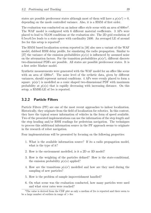 3.2. Positioning and Tracking 39states are possible predecessor states although most of them will have a p( s| s)= 0,depending on the mode controlled variance. Also, it is a HMM of first order.The evaluation was conducted on an indoor office style scene with an area of 600 m2.The WAF model is configured with 6 different material coefficients. 3 APs wereplaced to lead to NLOS conditions at the evaluation site. The 2D grid resolution of0. 5 mx 0. 5 m leads to a state space with cardinality 2400. An averaged LE of around3 m for this setup is reported3.The HMM based localization system reported in[16] also uses a variant of the WAFmodel, dubbed RSSI delay profile, for simulating the radio propagation. Similar to[27] the variance of the emission probabilities p( x| s) is influenced by assumed noiseon the attenuation factors. For the transition probabilities p( s| s), different discretetwo-dimensional PDFs are possible. All states are possible predecessor states. It isa first order Markov model.Synthetic measurements were generated with the WAF model for an office like scenewith an area of 1200 m2. The noise level of the sythetic data, given by differentvariances, should represent natural conditions. 4 APs were evenly placed to form asquare. p(s| s') is modelled as a conic shaped two-dimensional PDF with maximumprobability at p( s| s) that is rapidly decreasing with increasing distance. On thissetup, a RMSE-LE of 5 m is reported.3.2.2 Particle FiltersParticle Filters(PF) are one of the most recent approaches to indoor localization.Historically, they originate from the field of localization for robotics. In this context,they have the typical sensor information of vehicles in the form of speed available.Two of the presented implementations can use the information of the step length andthe step heading and/or RSSI readings for pedestrian navigation. The techniquesto process this additional information source in the PF approach seems to originatein the research of robot navigation.Four implementations will be presented by focusing on the following properties:1. What is the available information source? If its a radio propagation model,what is the type of it?2. How is the environment modelled, is it a 2D or 3D model?3. How is the weighting of the particles defined? How is the state-conditional,the emission probability p( x| s) applied?4. How are the transitions p( s| s) modelled and how are they used during thesampling of new particles?5. How is the problem of sample impoverishment handled?6. On what scene was the evaluation conducted, how many particles were usedand what error rates were reached?3The value is derived from the CDF plot as only a median of 2 m is reported and there seem tobe a large number of outliers in range of> 8 m