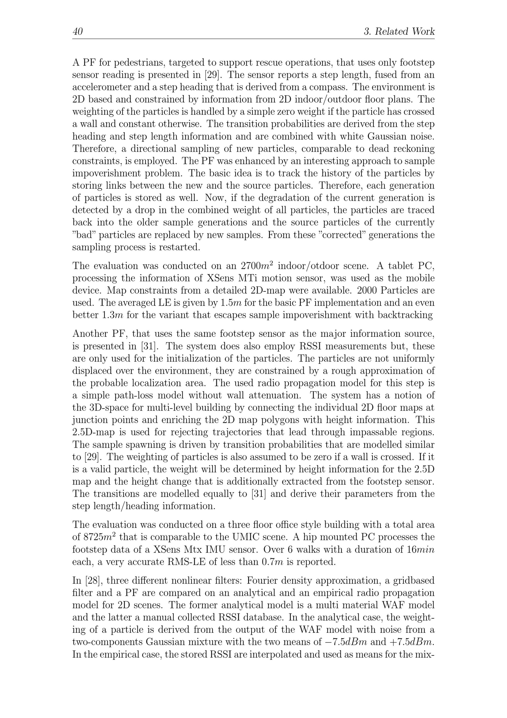 40 3. Related WorkA PF for pedestrians, targeted to support rescue operations, that uses only footstepsensor reading is presented in[29]. The sensor reports a step length, fused from anaccelerometer and a step heading that is derived from a compass. The environment is2D based and constrained by information from 2D indoor/outdoor floor plans. Theweighting of the particles is handled by a simple zero weight if the particle has crosseda wall and constant otherwise. The transition probabilities are derived from the stepheading and step length information and are combined with white Gaussian noise.Therefore, a directional sampling of new particles, comparable to dead reckoningconstraints, is employed. The PF was enhanced by an interesting approach to sampleimpoverishment problem. The basic idea is to track the history of the particles bystoring links between the new and the source particles. Therefore, each generationof particles is stored as well. Now, if the degradation of the current generation isdetected by a drop in the combined weight of all particles, the particles are tracedback into the older sample generations and the source particles of the currently"bad" particles are replaced by new samples. From these"corrected" generations thesampling process is restarted.The evaluation was conducted on an 2700 m2indoor/otdoor scene. A tablet PC,processing the information of XSens MTi motion sensor, was used as the mobiledevice. Map constraints from a detailed 2D-map were available. 2000 Particles areused. The averaged LE is given by 1. 5 m for the basic PF implementation and an evenbetter 1. 3 m for the variant that escapes sample impoverishment with backtrackingAnother PF, that uses the same footstep sensor as the major information source,is presented in[31]. The system does also employ RSSI measurements but, theseare only used for the initialization of the particles. The particles are not uniformlydisplaced over the environment, they are constrained by a rough approximation ofthe probable localization area. The used radio propagation model for this step isa simple path-loss model without wall attenuation. The system has a notion ofthe 3D-space for multi-level building by connecting the individual 2D floor maps atjunction points and enriching the 2D map polygons with height information. This2.5D-map is used for rejecting trajectories that lead through impassable regions.The sample spawning is driven by transition probabilities that are modelled similarto[29]. The weighting of particles is also assumed to be zero if a wall is crossed. If itis a valid particle, the weight will be determined by height information for the 2.5Dmap and the height change that is additionally extracted from the footstep sensor.The transitions are modelled equally to[31] and derive their parameters from thestep length/heading information.The evaluation was conducted on a three floor office style building with a total areaof 8725 m2that is comparable to the UMIC scene. A hip mounted PC processes thefootstep data of a XSens Mtx IMU sensor. Over 6 walks with a duration of 16 mineach, a very accurate RMS-LE of less than 0. 7 m is reported.In[28], three different nonlinear filters: Fourier density approximation, a gridbasedfilter and a PF are compared on an analytical and an empirical radio propagationmodel for 2D scenes. The former analytical model is a multi material WAF modeland the latter a manual collected RSSI database. In the analytical case, the weight-ing of a particle is derived from the output of the WAF model with noise from atwo-components Gaussian mixture with the two means of- 7. 5 dBm and+7. 5 dBm.In the empirical case, the stored RSSI are interpolated and used as means for the mix-
