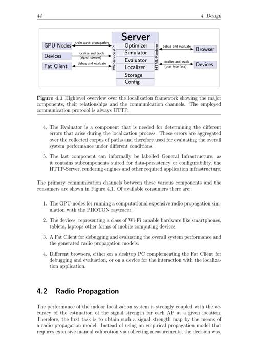 44 4. DesignFigure 4.1 Highlevel overview over the localization framework showing the majorcomponents, their relationships and the communication channels. The employedcommunication protocol is always HTTP.4. The Evaluator is a component that is needed for determining the differenterrors that arise during the localization process. These errors are aggregatedover the collected corpus of paths and therefore used for evaluating the overallsystem performance under different conditions.5. The last component can informally be labelled General Infrastructure, asit contains subcomponents suited for data-persistency or configurability, theHTTP-Server, rendering engines and other required application infrastructure.The primary communication channels between these various components and theconsumers are shown in Figure 4.1. Of available consumers there are:1. The GPU-nodes for running a computational expensive radio propagation sim-ulation with the PHOTON raytracer.2. The devices, representing a class of Wi-Fi capable hardware like smartphones,tablets, laptops other forms of mobile computing devices.3. A Fat Client for debugging and evaluating the overall system performance andthe generated radio propagation models.4. Different browsers, either on a desktop PC complementing the Fat Client fordebugging and evaluation, or on a device for the interaction with the localiza-tion application.4.2 Radio PropagationThe performance of the indoor localization system is strongly coupled with the ac-curacy of the estimation of the signal strength for each AP at a given location.Therefore, the first task is to obtain such a signal strength map by the means ofa radio propagation model. Instead of using an empirical propagation model thatrequires extensive manual calibration via collecting measurements, the decision was,