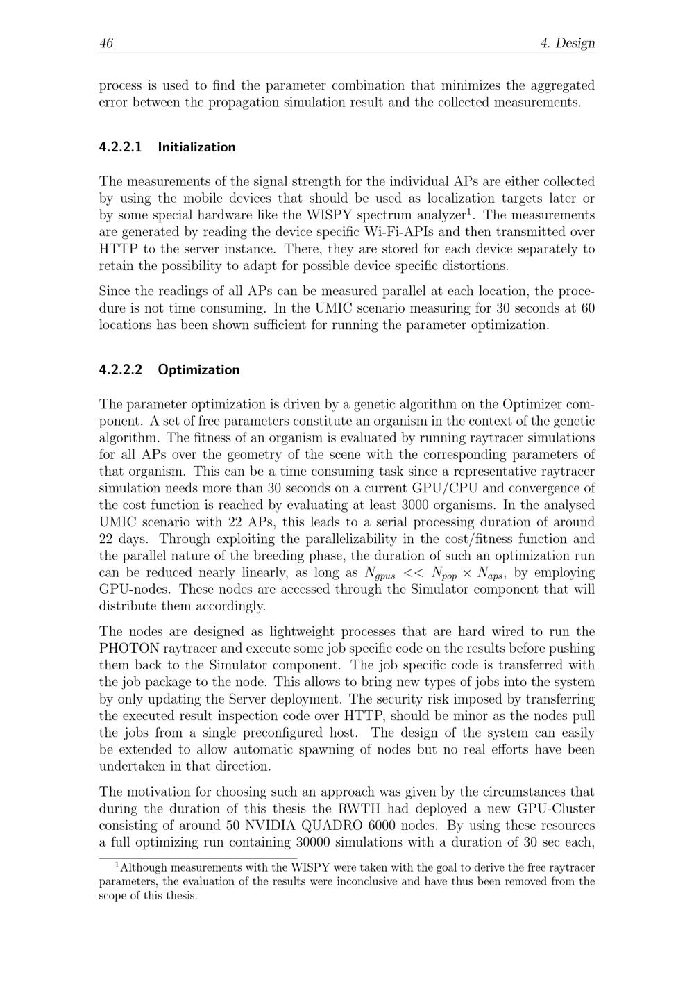 46 4. Designprocess is used to find the parameter combination that minimizes the aggregatederror between the propagation simulation result and the collected measurements.4.2.2.1 InitializationThe measurements of the signal strength for the individual APs are either collectedby using the mobile devices that should be used as localization targets later orby some special hardware like the WISPY spectrum analyzer1. The measurementsare generated by reading the device specific Wi-Fi-APIs and then transmitted overHTTP to the server instance. There, they are stored for each device separately toretain the possibility to adapt for possible device specific distortions.Since the readings of all APs can be measured parallel at each location, the proce-dure is not time consuming. In the UMIC scenario measuring for 30 seconds at 60locations has been shown sufficient for running the parameter optimization.4.2.2.2 OptimizationThe parameter optimization is driven by a genetic algorithm on the Optimizer com-ponent. A set of free parameters constitute an organism in the context of the geneticalgorithm. The fitness of an organism is evaluated by running raytracer simulationsfor all APs over the geometry of the scene with the corresponding parameters ofthat organism. This can be a time consuming task since a representative raytracersimulation needs more than 30 seconds on a current GPU/CPU and convergence ofthe cost function is reached by evaluating at least 3000 organisms. In the analysedUMIC scenario with 22 APs, this leads to a serial processing duration of around22 days. Through exploiting the parallelizability in the cost/fitness function andthe parallel nature of the breeding phase, the duration of such an optimization runcan be reduced nearly linearly, as long as Ngpus<< Npop× Naps, by employingGPU-nodes. These nodes are accessed through the Simulator component that willdistribute them accordingly.The nodes are designed as lightweight processes that are hard wired to run thePHOTON raytracer and execute some job specific code on the results before pushingthem back to the Simulator component. The job specific code is transferred withthe job package to the node. This allows to bring new types of jobs into the systemby only updating the Server deployment. The security risk imposed by transferringthe executed result inspection code over HTTP, should be minor as the nodes pullthe jobs from a single preconfigured host. The design of the system can easilybe extended to allow automatic spawning of nodes but no real efforts have beenundertaken in that direction.The motivation for choosing such an approach was given by the circumstances thatduring the duration of this thesis the RWTH had deployed a new GPU-Clusterconsisting of around 50 NVIDIA QUADRO 6000 nodes. By using these resourcesa full optimizing run containing 30000 simulations with a duration of 30 sec each,1Although measurements with the WISPY were taken with the goal to derive the free raytracerparameters, the evaluation of the results were inconclusive and have thus been removed from thescope of this thesis.