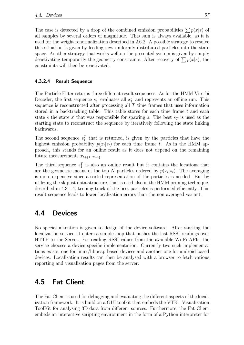 4.4. Devices 57The case is detected by a drop of the combined emission probabilities p( x| s) ofall samples by several orders of magnitude. This sum is always available, as it isused for the weight renormalization described in 2.6.2. A possible strategy to resolvethis situation is given by feeding new uniformly distributed particles into the statespace. Another strategy that works well on the presented system is given by simplydeactivating temporarily the geometry constraints. After recovery of p( x| s), theconstraints will then be reactivated.4.3.2.4 Result SequenceThe Particle Filter returns three different result sequences. As for the HMM ViterbiDecoder, the first sequence sT1evaluates all x1Tand represents an offline run. Thissequence is reconstructed after processing all T time frames that uses informationstored in a backtracking table. This table stores for each time frame t and eachstate s the state s that was responsible for spawing s. The best sTis used as thestarting state to reconstruct the sequence by iteratively following the state linkingbackwards.The second sequence s1Tthat is returned, is given by the particles that have thehighest emission probability p( xt| st) for each time frame t. As in the HMM ap-proach, this stands for an online result as it does not depend on the remainingfuture measurements xt+{ 1..T- t}.The third sequence sT1is also an online result but it contains the locations thatare the geometric means of the top N particles ordered by p( xt| st). The averagingis more expensive since a sorted representation of the particles is needed. But byutilizing the skiplist data-structure, that is used also in the HMM pruning technique,described in 4.3.1.4, keeping track of the best particles is performed efficiently. Thisresult sequence leads to lower localization errors than the non-averaged variant.4.4 DevicesNo special attention is given to design of the device software. After starting thelocalization service, it enters a simple loop that pushes the last RSSI readings overHTTP to the Server. For reading RSSI values from the available Wi-Fi-APIs, theservice chooses a device specific implementation. Currently two such implementa-tions exists, one for linux/libpcap based devices and another one for android baseddevices. Localization results can then be analysed with a browser to fetch variousreporting and visualization pages from the server.4.5 Fat ClientThe Fat Client is used for debugging and evaluating the different aspects of the local-ization framework. It is build on a GUI toolkit that embeds the VTK- VisualizationToolKit for analysing 3D-data from different sources. Furthermore, the Fat Clientembeds an interactive scripting environment in the form of a Python interpreter for