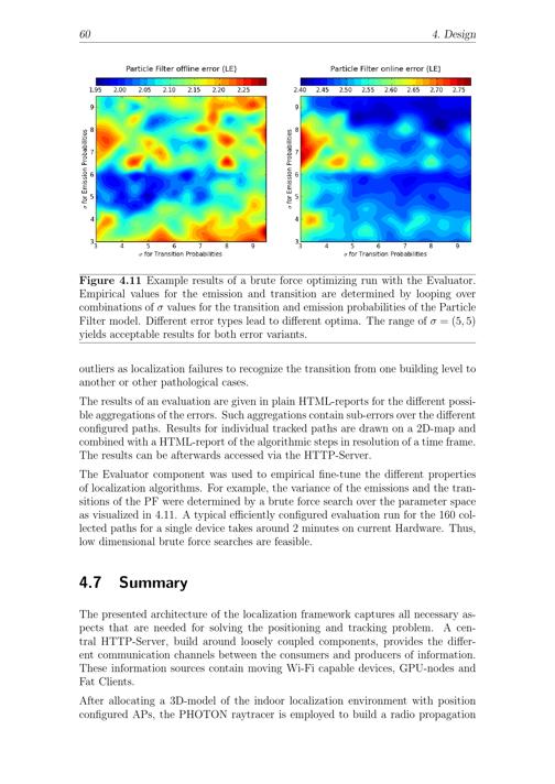 60 4. DesignFigure 4.11 Example results of a brute force optimizing run with the Evaluator.Empirical values for the emission and transition are determined by looping overcombinations of values for the transition and emission probabilities of the ParticleFilter model. Different error types lead to different optima. The range of =(5, 5)yields acceptable results for both error variants.outliers as localization failures to recognize the transition from one building level toanother or other pathological cases.The results of an evaluation are given in plain HTML-reports for the different possi-ble aggregations of the errors. Such aggregations contain sub-errors over the differentconfigured paths. Results for individual tracked paths are drawn on a 2D-map andcombined with a HTML-report of the algorithmic steps in resolution of a time frame.The results can be afterwards accessed via the HTTP-Server.The Evaluator component was used to empirical fine-tune the different propertiesof localization algorithms. For example, the variance of the emissions and the tran-sitions of the PF were determined by a brute force search over the parameter spaceas visualized in 4.11. A typical efficiently configured evaluation run for the 160 col-lected paths for a single device takes around 2 minutes on current Hardware. Thus,low dimensional brute force searches are feasible.4.7 SummaryThe presented architecture of the localization framework captures all necessary as-pects that are needed for solving the positioning and tracking problem. A cen-tral HTTP-Server, build around loosely coupled components, provides the differ-ent communication channels between the consumers and producers of information.These information sources contain moving Wi-Fi capable devices, GPU-nodes andFat Clients.After allocating a 3D-model of the indoor localization environment with positionconfigured APs, the PHOTON raytracer is employed to build a radio propagation