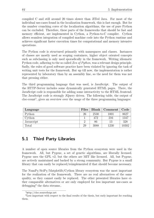 64 5. Implementationcompiled C and still around 20 times slower than JITed Java. For most of theindividual use-cases found in the localization framework, this is fast enough. But forthe number crunching cores of the localization algorithms, the use of pure Python can be excluded. Therefore, these parts of the frameworks that should be fast andmemory efficient, are implemented in Cython, a Python -to-C compiler. Cythonallows seamless integration of compiled machine code into the Python runtime andachieves significant faster execution times for computational and memory intensiveoperations.The Python code is structured primarily with namespaces and classes. Instancesof classes are mostly used as scoping containers, higher object oriented conceptssuch as subclassing is only used sporadically in the framework. Writing idiomaticPython code, adhering to the so called Zen of Python, was a relevant design principle.Sadly, the rules of good software practice have been violated by ignoring the task ofwriting unit tests for the framework. But up till now, the implementation is ratherrepresented by laboratory than by an assembly line, so the need for them was notthat pressing either.The third programming language that was used, is JavaScript. The output ofthe HTTP-Server includes some dynamically generated HTML pages. There, theJavaScript code is responsible for adding some interactivity to the HTML frontend.The JavaScript code is strongly JQuery driven. The following table, the output ofcloc-count1, gives an overview over the usage of the three programming languages:LanguagePythonCythonJavascriptTotalFiles261229Blank2530472863088Comment1001216131230Code86271347328103025.1 Third Party LibrariesA number of open source libraries from the Python ecosystem were used in theframework. All, but Pygene, a set of genetic algorithms, are liberally licensed.Pygene uses the GPL v2, but the others are MIT like licensed. All, but Pygene,are actively maintained and backed by a strong community. But Pygene is a smalllibrary that can easily be replaced/reimplemented if that should become necessary.The NumPy/SciPy/Matplotlib/Cython library ecosystem was the most importantfor the realization of the framework. There are no real alternatives of the samequality, so they cannot easily be replaced. The other presented libraries have ei-ther comparable alternatives or are only employed for less important use-cases asdebugging2the data streams..1http://cloc.sourceforge.net2Less important with respect to the final results of the thesis, but surly important for reachingthem.