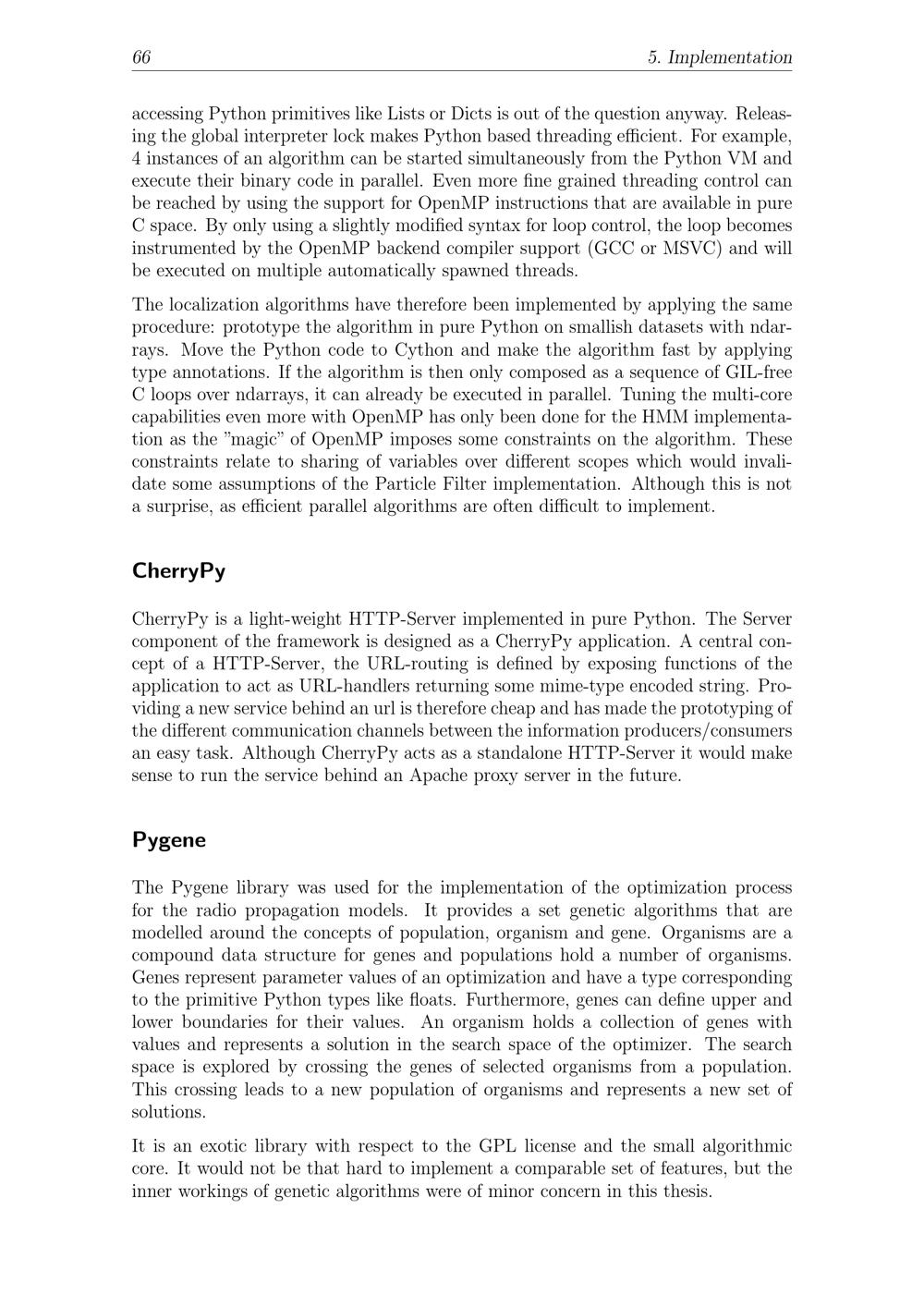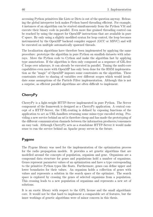 66 5. Implementationaccessing Python primitives like Lists or Dicts is out of the question anyway. Releas-ing the global interpreter lock makes Python based threading efficient. For example,4 instances of an algorithm can be started simultaneously from the Python VM andexecute their binary code in parallel. Even more fine grained threading control canbe reached by using the support for OpenMP instructions that are available in pureC space. By only using a slightly modified syntax for loop control, the loop becomesinstrumented by the OpenMP backend compiler support(GCC or MSVC) and willbe executed on multiple automatically spawned threads.The localization algorithms have therefore been implemented by applying the sameprocedure: prototype the algorithm in pure Python on smallish datasets with ndar-rays. Move the Python code to Cython and make the algorithm fast by applyingtype annotations. If the algorithm is then only composed as a sequence of GIL-freeC loops over ndarrays, it can already be executed in parallel. Tuning the multi-corecapabilities even more with OpenMP has only been done for the HMM implementa-tion as the"magic" of OpenMP imposes some constraints on the algorithm. Theseconstraints relate to sharing of variables over different scopes which would invali-date some assumptions of the Particle Filter implementation. Although this is nota surprise, as efficient parallel algorithms are often difficult to implement.CherryPyCherryPy is a light-weight HTTP-Server implemented in pure Python . The Servercomponent of the framework is designed as a CherryPy application. A central con-cept of a HTTP -Server, the URL-routing is defined by exposing functions of theapplication to act as URL-handlers returning some mime-type encoded string. Pro-viding a new service behind an url is therefore cheap and has made the prototyping ofthe different communication channels between the information producers/consumersan easy task. Although CherryPy acts as a standalone HTTP -Server it would makesense to run the service behind an Apache proxy server in the future.PygeneThe Pygene library was used for the implementation of the optimization processfor the radio propagation models. It provides a set genetic algorithms that aremodelled around the concepts of population, organism and gene. Organisms are acompound data structure for genes and populations hold a number of organisms.Genes represent parameter values of an optimization and have a type correspondingto the primitive Python types like floats. Furthermore, genes can define upper andlower boundaries for their values. An organism holds a collection of genes withvalues and represents a solution in the search space of the optimizer. The searchspace is explored by crossing the genes of selected organisms from a population.This crossing leads to a new population of organisms and represents a new set ofsolutions.It is an exotic library with respect to the GPL license and the small algorithmiccore. It would not be that hard to implement a comparable set of features, but theinner workings of genetic algorithms were of minor concern in this thesis.