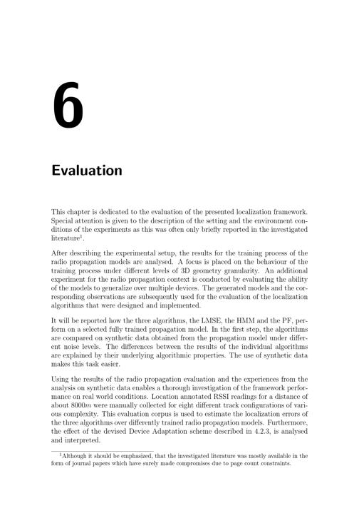 6EvaluationThis chapter is dedicated to the evaluation of the presented localization framework.Special attention is given to the description of the setting and the environment con-ditions of the experiments as this was often only briefly reported in the investigatedliterature1.After describing the experimental setup, the results for the training process of theradio propagation models are analysed. A focus is placed on the behaviour of thetraining process under different levels of 3D geometry granularity. An additionalexperiment for the radio propagation context is conducted by evaluating the abilityof the models to generalize over multiple devices. The generated models and the cor-responding observations are subsequently used for the evaluation of the localizationalgorithms that were designed and implemented.It will be reported how the three algorithms, the LMSE, the HMM and the PF, per-form on a selected fully trained propagation model. In the first step, the algorithmsare compared on synthetic data obtained from the propagation model under differ-ent noise levels. The differences between the results of the individual algorithmsare explained by their underlying algorithmic properties. The use of synthetic datamakes this task easier.Using the results of the radio propagation evaluation and the experiences from theanalysis on synthetic data enables a thorough investigation of the framework perfor-mance on real world conditions. Location annotated RSSI readings for a distance ofabout 8000 m were manually collected for eight different track configurations of vari-ous complexity. This evaluation corpus is used to estimate the localization errors ofthe three algorithms over differently trained radio propagation models. Furthermore,the effect of the devised Device Adaptation scheme described in 4.2.3, is analysedand interpreted.1Although it should be emphasized, that the investigated literature was mostly available in theform of journal papers which have surely made compromises due to page count constraints.