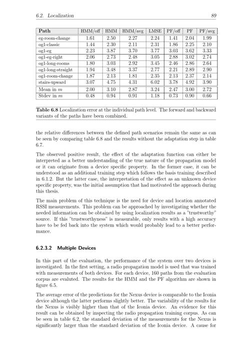 6.2. Localization 89Patheg-room-changeog1-classicog1-egog1-eg-rightog1-long-roomsog1-long-straightog1-room-changestairs-upwardMean in mStdev in mHMM/off HMM HMM/avg LMSE PF/off PF PF/avg1.61 2.50 2.27 2.24 1.41 2.04 1.991.44 2.30 2.11 2.31 1.86 2.25 2.102.23 3.87 3.70 3.77 3.03 3.62 3.332.06 2.73 2.48 3.05 2.88 3.02 2.741.80 3.03 2.92 3.45 2.46 2.86 2.641.94 3.48 3.37 2.77 2.21 2.89 2.901.87 2.13 1.81 2.35 2.13 2.37 2.143.07 4.75 4.31 6.02 3.78 4.92 3.902.00 3.10 2.87 3.24 2.47 3.00 2.720.48 0.94 0.91 1.18 0.73 0.90 0.66Table 6.8 Localization error at the individual path level. The forward and backwardvariants of the paths have been combined.the relative differences between the defined path scenarios remain the same as canbe seen by comparing table 6.8 and the results without the adaptation step in table6.7.The observed positive result, the effect of the adaptation function can either beinterpreted as a better understanding of the true nature of the propagation modelor it can originate from a device specific property. In the former case, it can beunderstood as an additional training step which follows the basis training describedin 6.1.2. But the latter case, the interpretation of the effect as an unknown devicespecific property, was the initial assumption that had motivated the approach duringthis thesis.The main problem of this technique is the need for device and location annotatedRSSI measurements. This problem can be approached by investigating whether theneeded information can be obtained by using localization results as a"trustworthy"source. If this"trustworthyness" is measurable, only results with a high accuracyhave to be fed back into the system which would probably lead to a better perfor-mance.6.2.3.2 Multiple DevicesIn this part of the evaluation, the performance of the system over two devices isinvestigated. In the first setting, a radio propagation model is used that was trainedwith measurements of both devices. For each device, 160 paths from the evaluationcorpus are evaluted. The results for the HMM and the PF algorithm are shown infigure 6.5.The average error of the predictions for the Nexus device is comparable to the Iconiadevice although the latter performs slightly better. The variability of the results forthe Nexus is visibly higher than that of the Iconia device. An evidence for thisresult can be obtained by inspecting the radio propagation training corpus. As canbe seen in table 6.2, the standard deviation of the measurements for the Nexus issignificantly larger than the standard deviation of the Iconia device. A cause for