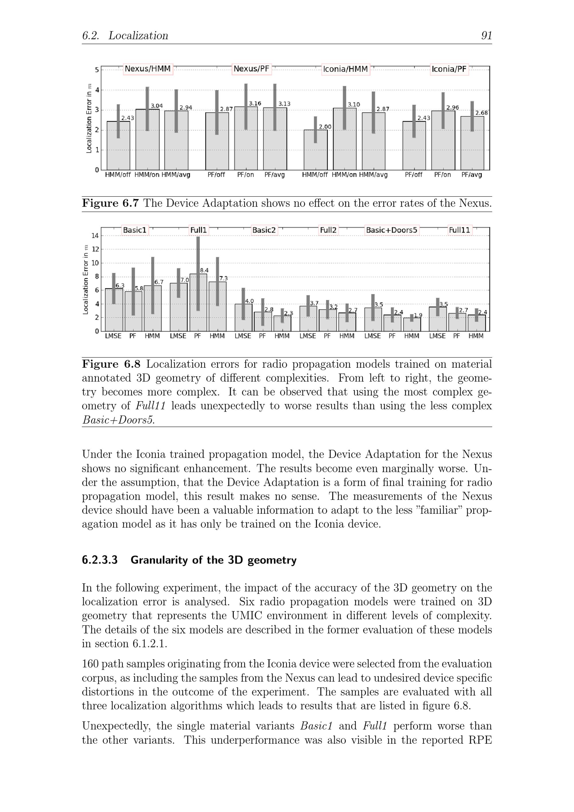 6.2. Localization 91Figure 6.7 The Device Adaptation shows no effect on the error rates of the Nexus.Figure 6.8 Localization errors for radio propagation models trained on materialannotated 3D geometry of different complexities. From left to right, the geome-try becomes more complex. It can be observed that using the most complex ge-ometry of Full11 leads unexpectedly to worse results than using the less complexBasic+Doors5.Under the Iconia trained propagation model, the Device Adaptation for the Nexusshows no significant enhancement. The results become even marginally worse. Un-der the assumption, that the Device Adaptation is a form of final training for radiopropagation model, this result makes no sense. The measurements of the Nexusdevice should have been a valuable information to adapt to the less"familiar" prop-agation model as it has only be trained on the Iconia device.6.2.3.3 Granularity of the 3D geometryIn the following experiment, the impact of the accuracy of the 3D geometry on thelocalization error is analysed. Six radio propagation models were trained on 3Dgeometry that represents the UMIC environment in different levels of complexity.The details of the six models are described in the former evaluation of these modelsin section 6.1.2.1.160 path samples originating from the Iconia device were selected from the evaluationcorpus, as including the samples from the Nexus can lead to undesired device specificdistortions in the outcome of the experiment. The samples are evaluated with allthree localization algorithms which leads to results that are listed in figure 6.8.Unexpectedly, the single material variants Basic1 and Full1 perform worse thanthe other variants. This underperformance was also visible in the reported RPE