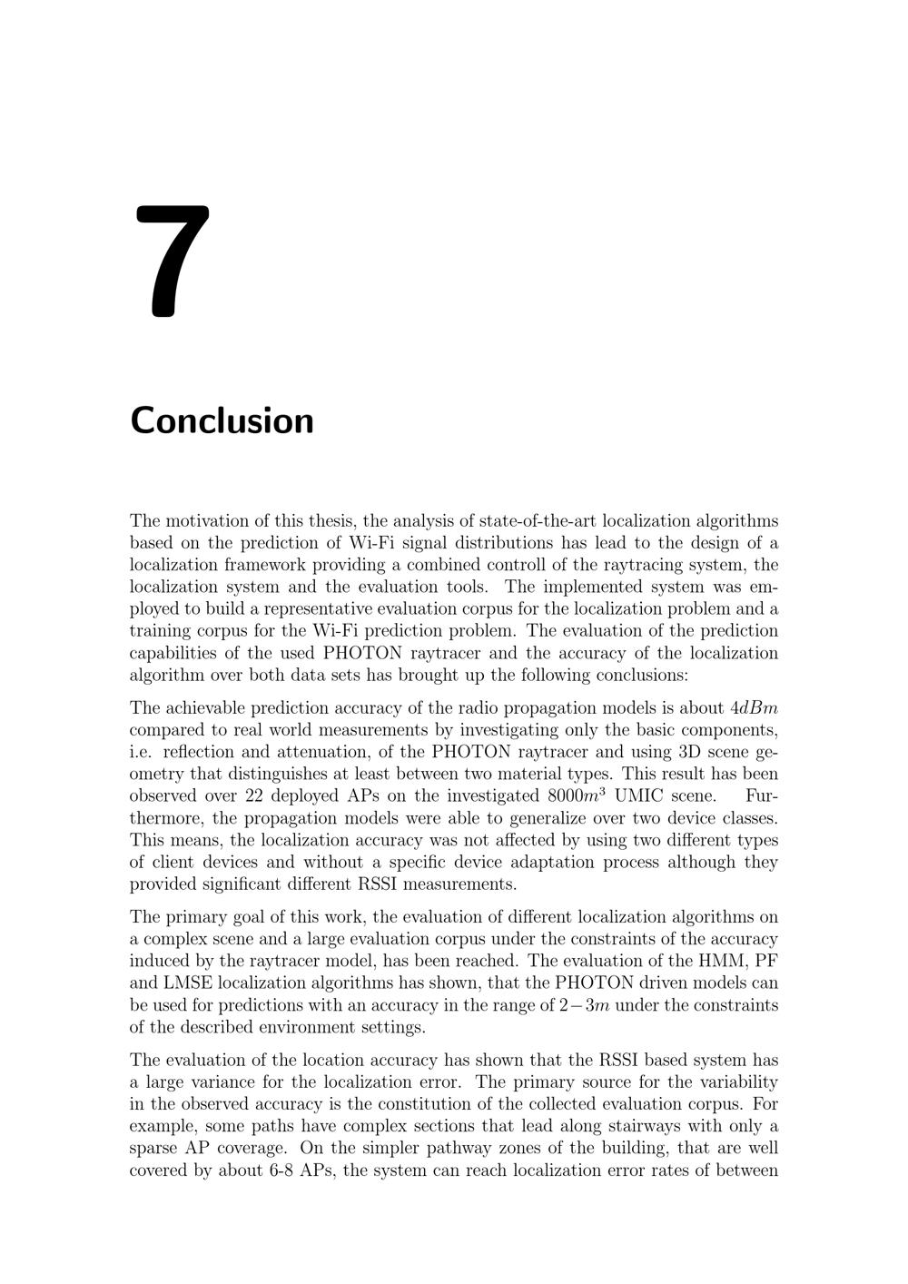 7ConclusionThe motivation of this thesis, the analysis of state-of-the-art localization algorithmsbased on the prediction of Wi-Fi signal distributions has lead to the design of alocalization framework providing a combined controll of the raytracing system, thelocalization system and the evaluation tools. The implemented system was em-ployed to build a representative evaluation corpus for the localization problem and atraining corpus for the Wi-Fi prediction problem. The evaluation of the predictioncapabilities of the used PHOTON raytracer and the accuracy of the localizationalgorithm over both data sets has brought up the following conclusions:The achievable prediction accuracy of the radio propagation models is about 4 dBmcompared to real world measurements by investigating only the basic components,i.e. reflection and attenuation, of the PHOTON raytracer and using 3D scene ge-ometry that distinguishes at least between two material types. This result has beenobserved over 22 deployed APs on the investigated 8000 m3UMIC scene. Fur-thermore, the propagation models were able to generalize over two device classes.This means, the localization accuracy was not affected by using two different typesof client devices and without a specific device adaptation process although theyprovided significant different RSSI measurements.The primary goal of this work, the evaluation of different localization algorithms ona complex scene and a large evaluation corpus under the constraints of the accuracyinduced by the raytracer model, has been reached. The evaluation of the HMM, PFand LMSE localization algorithms has shown, that the PHOTON driven models canbe used for predictions with an accuracy in the range of 2- 3 m under the constraintsof the described environment settings.The evaluation of the location accuracy has shown that the RSSI based system hasa large variance for the localization error. The primary source for the variabilityin the observed accuracy is the constitution of the collected evaluation corpus. Forexample, some paths have complex sections that lead along stairways with only asparse AP coverage. On the simpler pathway zones of the building, that are wellcovered by about 6-8 APs, the system can reach localization error rates of between